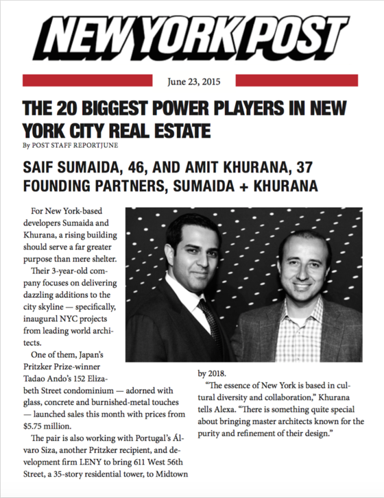 For New York-based developers Sumaida and Khurana, a rising building should serve a far greater purpose than mere shelter. Their 3-year-old company focuses on delivering dazzling additions to the city skyline — specifically, inaugural NYC projects from leading world architects. One of them, Japan’s Pritzker Prize-winner Tadao Ando’s 152 Elizabeth Street condominium — adorned with glass, concrete and burnished-metal touches — launched sales this month with prices from $5.75 million.